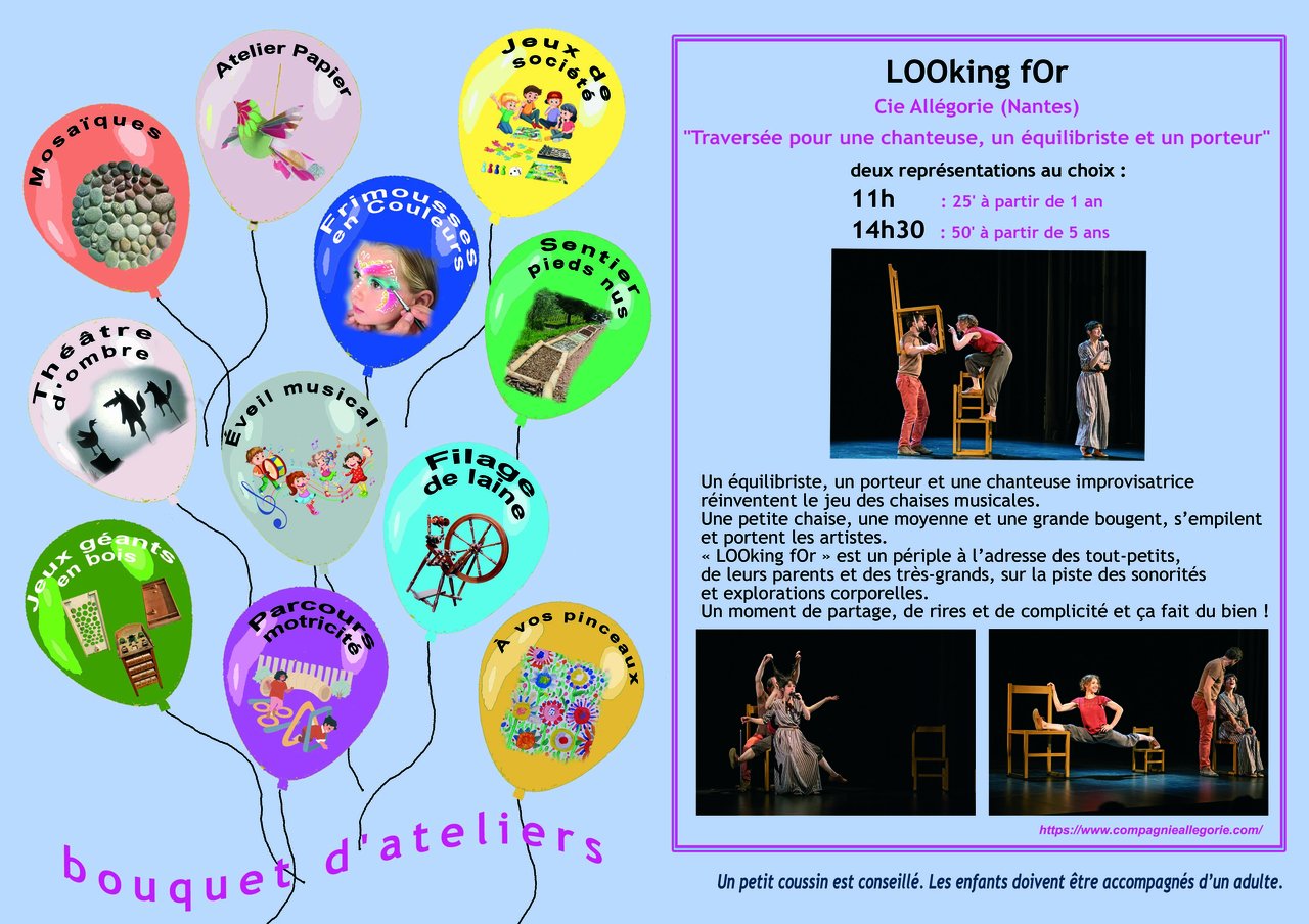 Ateliers créatifs tout au long de la journée : mosaïque, jeux, éveil musical, filage de laine, parcours motricité, théâtre d'ombre...